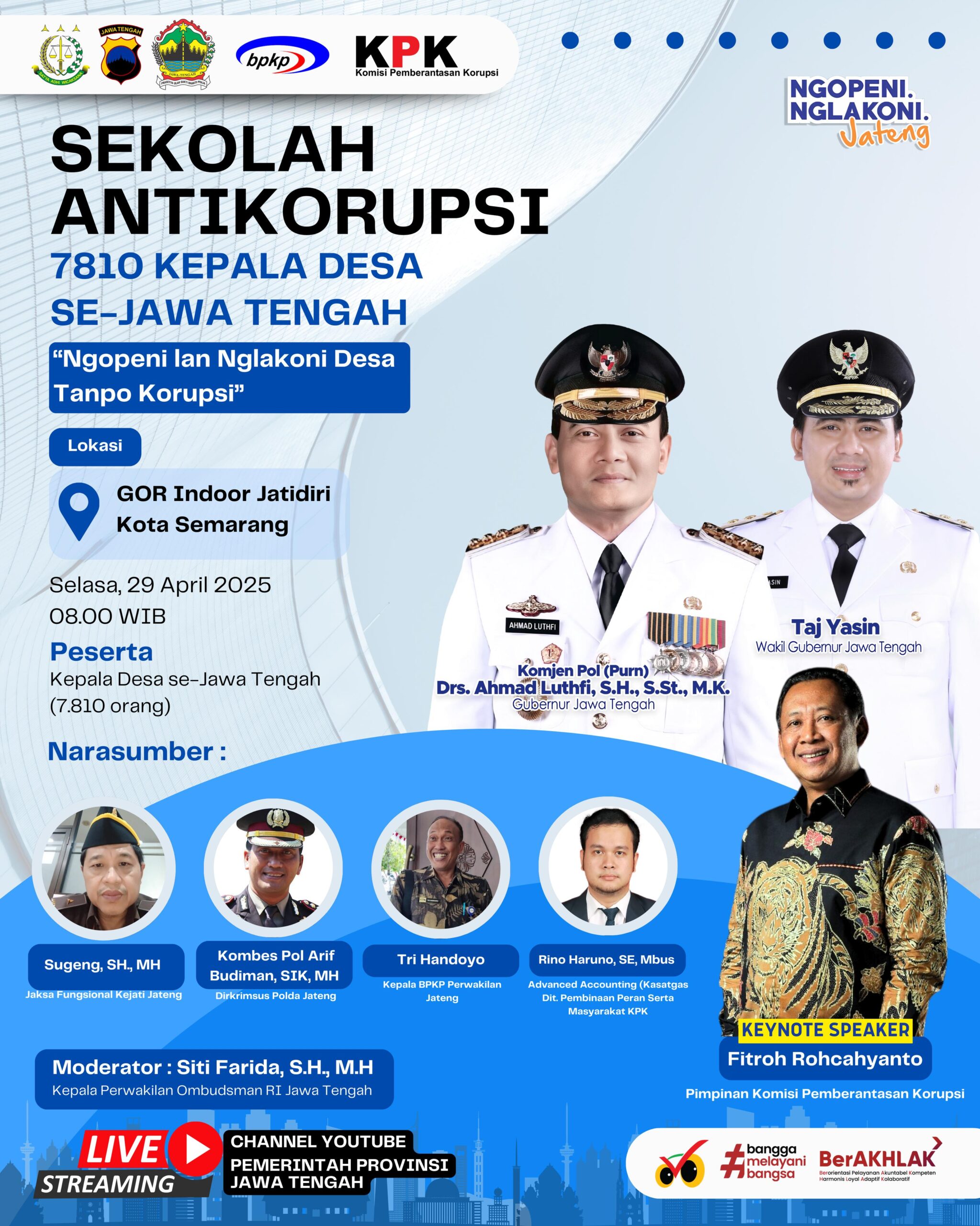 Sekolah Anti Korupsi dengan tagline “Ngopeni Nglakoni Desa Tanpo Korupsi” itu akan digelar di GOR Indoor Kompleks Stadion jatidiri Kota Semarang pada Selasa 29 April 2025.