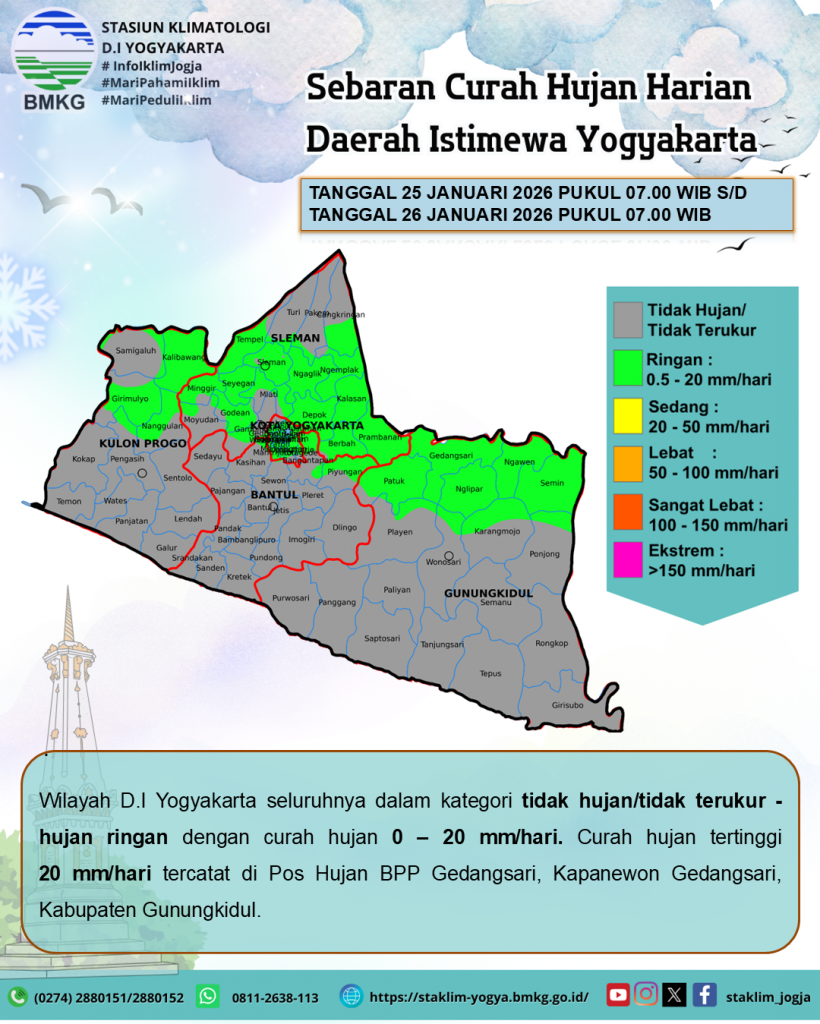 Analisis Curah Hujan Harian 27 Januari 2026 redaksi27 Januari 2026 Pos terkaitAda 20 persen Penduduk Indonesia Alami Gangguan Mental Emosional dan 9,8% Remaja berpikir Bunuh Diri31.750 Flora dan 744 Ribu Fauna ada di Indonesia, UGM dan BRIN Dorong Penguatan Riset BiodiversitasIndonesia Tegaskan Komitmen Perjuangkan Kemerdekaan Palestina Lewat Board of PeaceDirektur Perumda Pasar Kota Kupang Fokus Pembenahan InternalJalan Kota Pekalongan 80 persen Rusak, DPUPR Lakukan Percepatan Perbaikan Saat Keterbatasan AnggaranPengelolaan Sumber Daya Air, Energi, dan Pangan untuk Pertanian Berkelanjutan