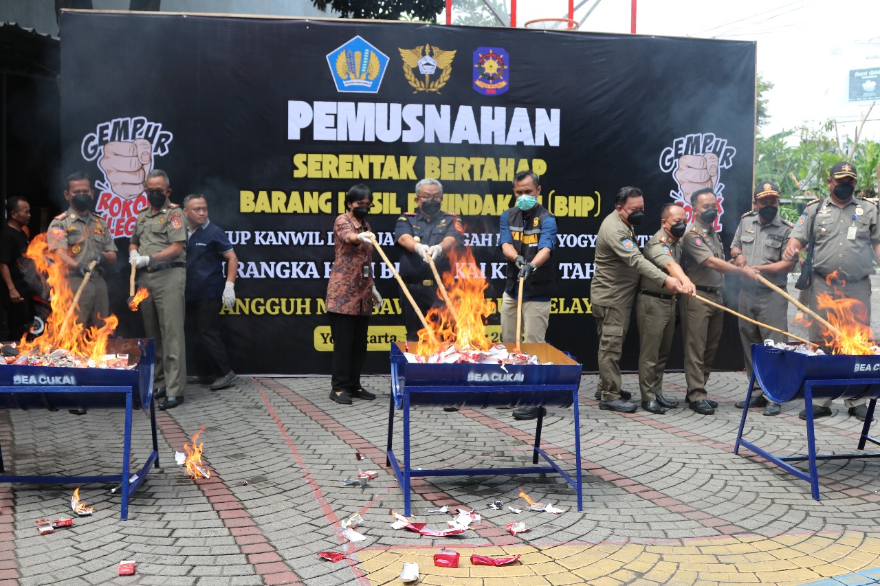 Dimusnahkan dengan cara dibakar di tong Kegiatan pemusnahan ini turut dihadiri oleh perwakilan Kantor Wilayah DJKN Jawa Tengah dan D.I. Yogyakarta beserta Kepala KPKNL Yogyakarta, perwakilan Kantor Wilayah DJBC Jawa Tengah dan D.I. Yogyakarta, Satuan Polisi Pamong Praja dari wilayah kerja D.I. Yogyakarta dan Magelang, serta awak media cetak maupun elektronik.