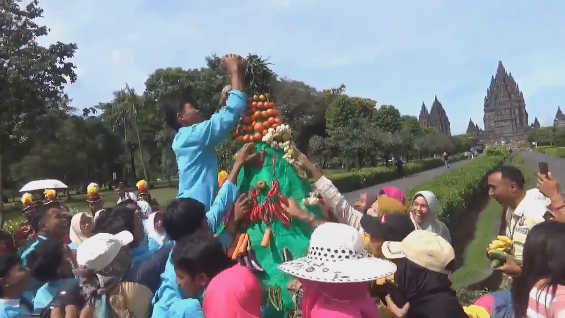 Ratusan wisatawan antusias mengikuti acara kirab budaya yang digelar di Kompleks Candi Prambanan, Klaten, Jawa Tengah, pada Senin (14/1/2025). Puncak acara ini ditandai dengan aksi berebut gunungan hasil bumi berupa cabai, buah-buahan, dan sayur-mayur yang menarik perhatian pengunjung.