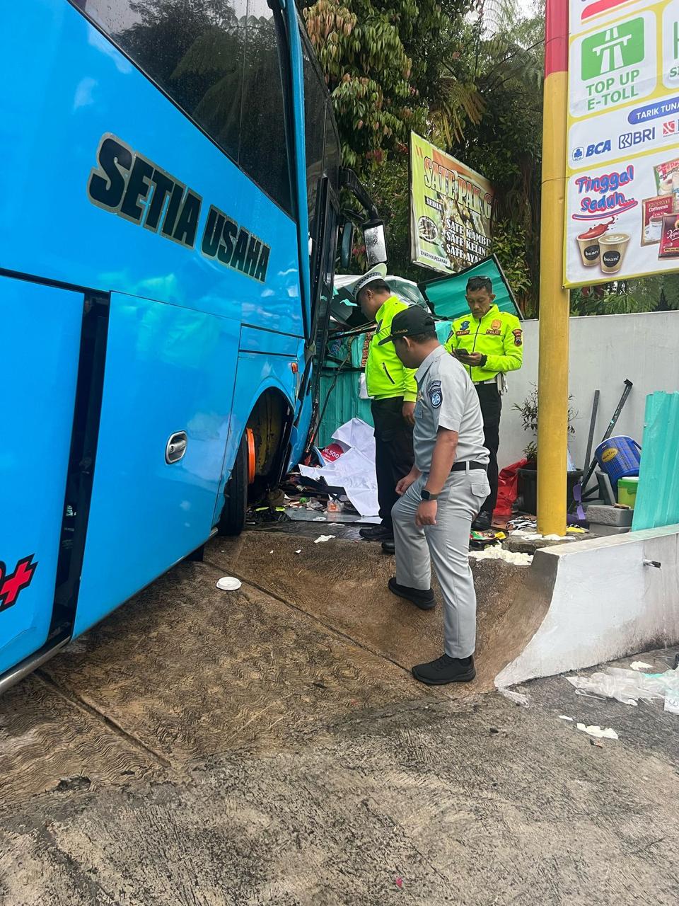 “Dugaan awal, bus mengalami rem blong. Pengemudi berusaha menyelamatkan diri dengan berbelok ke kiri, karena jika belok ke kanan, bus berpotensi meluncur ke jurang, apalagi membawa penumpang. Namun, naas, bus tetap menabrak penjual es teh,” ungkapnya.