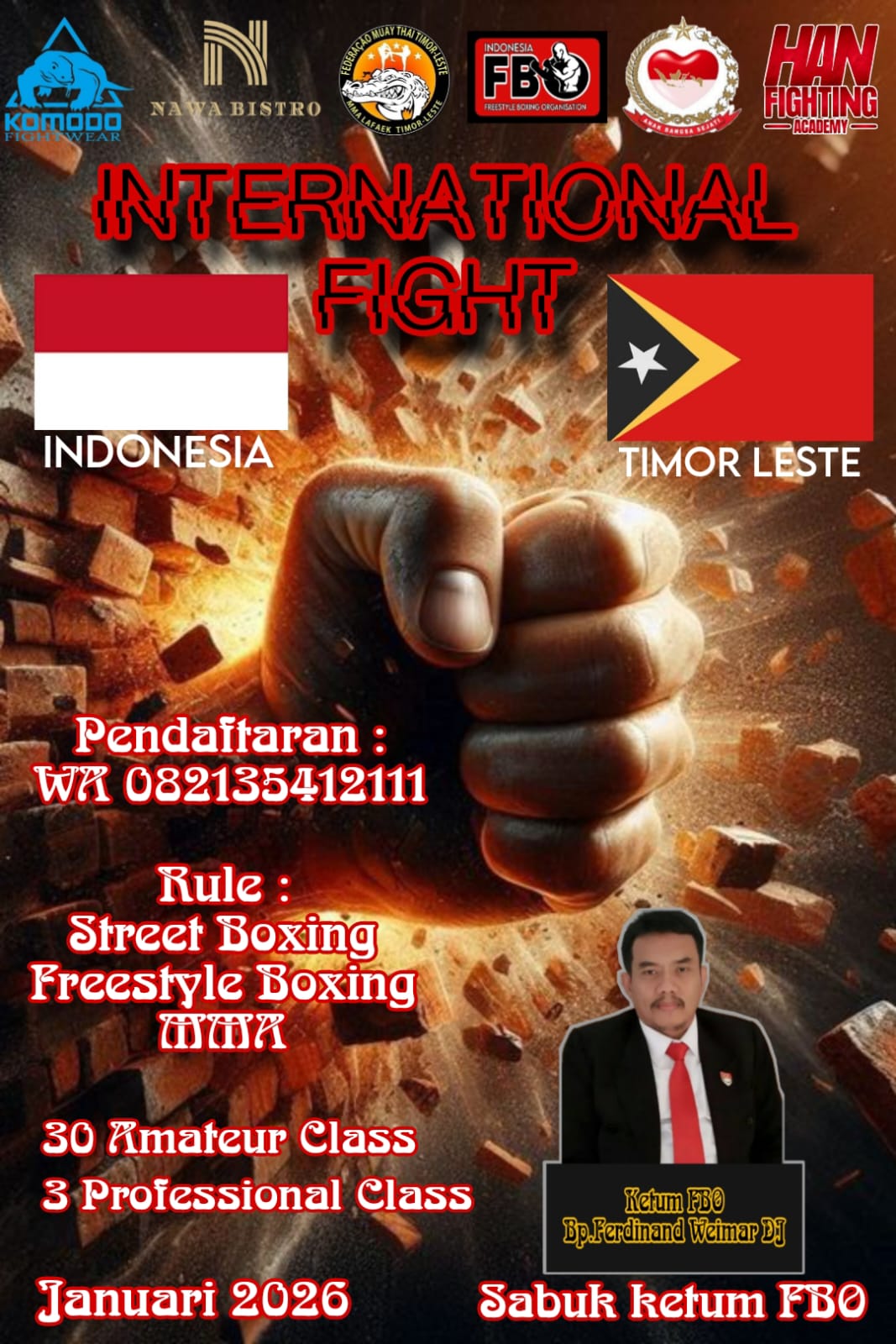 “Ini bukan hanya pertandingan pertama FBO, ini panggung kehormatan. Kita tampilkan petarung berprestasi agar Indonesia hadir dengan harga diri,” ujar Presiden FBO Indonesia, Ferdinand Weimar DJ.