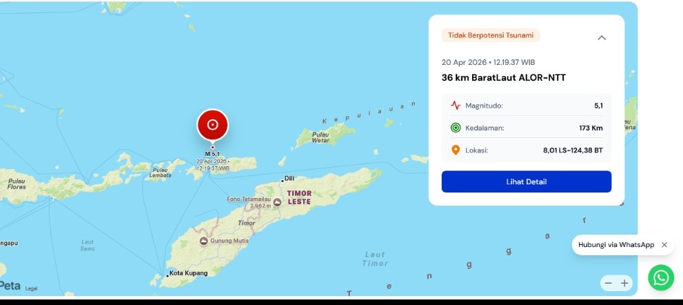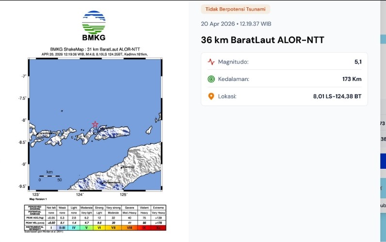 Gempa Bumi M5,1 Terjadi di 36 km BaratLaut Alor NTT, Tidak Berpotensi Tsunami redaksi20 April 2026 Sumber Foto : BMKG Bacaan LainnyaChristian Widodo, Sang Pelayan Rakyat, Memimpin Kota dengan Hati NuraniRapat Evaluasi dan Koordinasi Lintas Sektor : 108 Keputusan Dihasilkan, Tonggak Baru Kolaborasi Pembangunan Kota KupangGuru MAN Manggarai Resmi Jadi Tersangka, Pengacara : Demi Menjaga Marwah Anaknya yang jadi Korban Pelecehan Pos terkaitPolda DIY Lepas 33 Personel Calon Jamaah Haji 2026Polisi Pukul Mundur Pendemo dalam Simulasi, Polres Karanganyar Uji Kesiapan Hadapi Aksi AnarkisPeringatan Hari Keris Nasional, dari Senjata Perang kini jadi KoleksiKPK Periksa Wakil Ketua DPRD Kabupaten Pekalongan, Dugaan Korupsi Pengadaan Tenaga OutsourcingAksi Cepat Bhabinkamtibmas dan Warga Atasi Jalan Licin Akibat Solar di KandangserangPola Makan Masyarakat diwarnai Konsumsi Makanan Olahan, Tinggi Gula, Garam, dan Lemak ; Sumber Masalah Pemenuhan Gizi