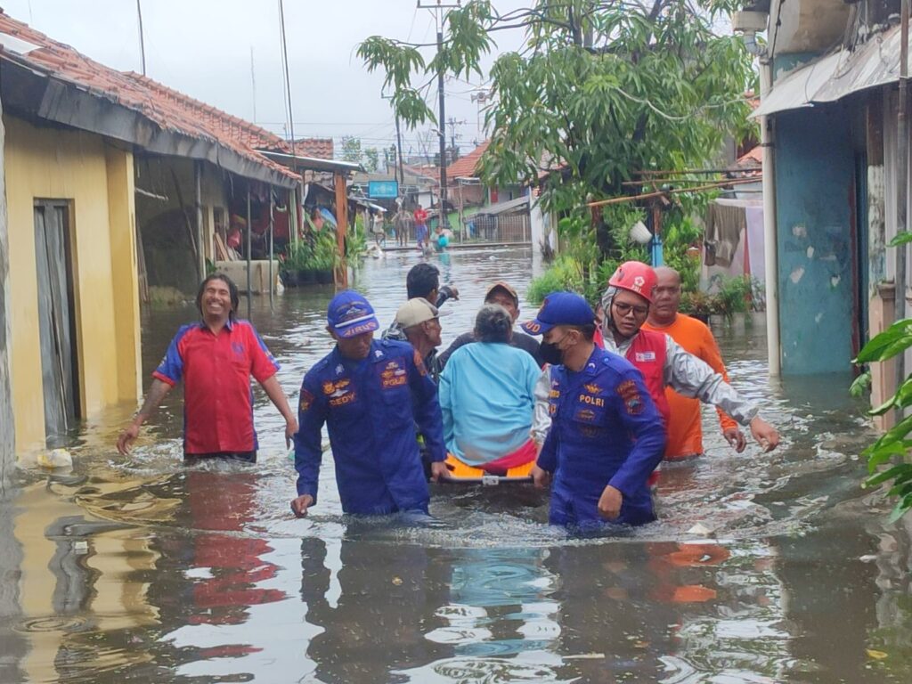 Kota Pekalongan | Hujan deras yang mengguyur Kota Pekalongan selama tiga hari terakhir menyebabkan banjir di sejumlah wilayah. Ditpolairud Polda Jateng bersama BPBD dan stakeholder terkait bergerak cepat mengevakuasi warga terdampak ke tempat yang lebih aman, terutama kelompok rentan seperti lansia, anak-anak, ibu hamil, dan warga yang sedang sakit.