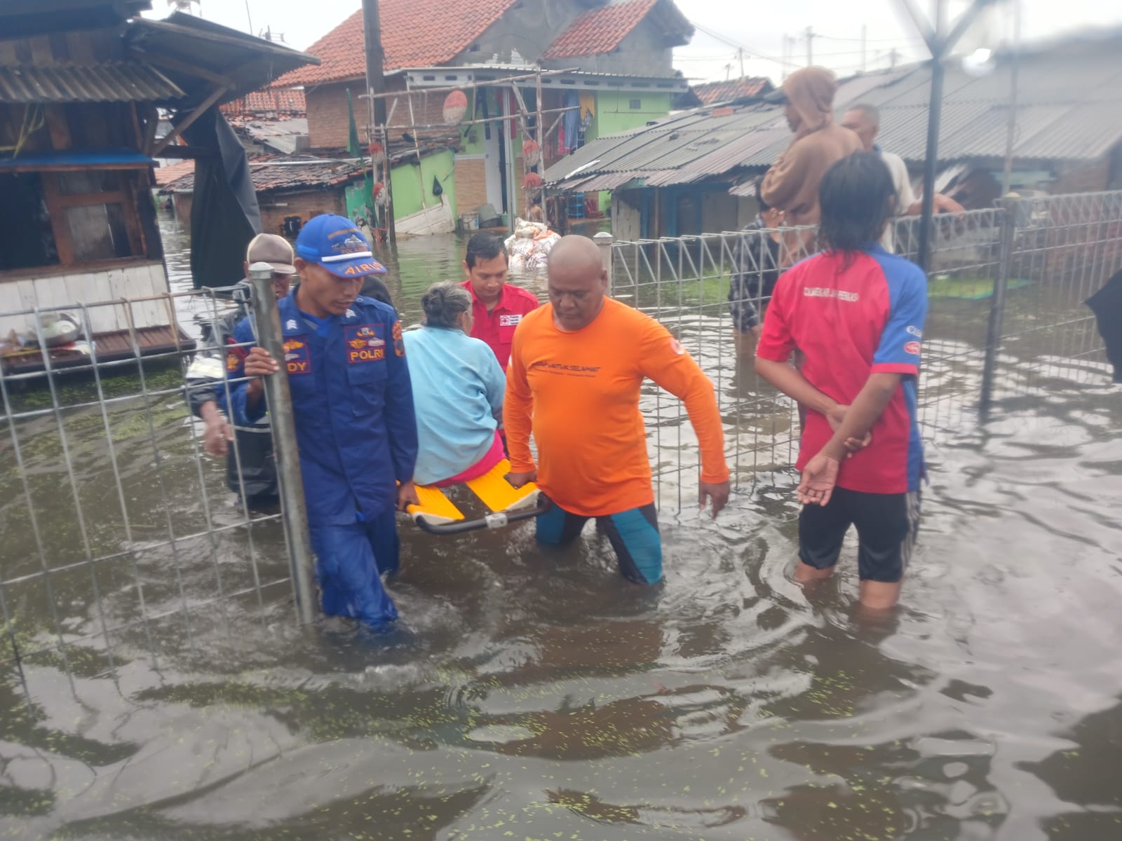 Kota Pekalongan | Hujan deras yang mengguyur Kota Pekalongan selama tiga hari terakhir menyebabkan banjir di sejumlah wilayah. Ditpolairud Polda Jateng bersama BPBD dan stakeholder terkait bergerak cepat mengevakuasi warga terdampak ke tempat yang lebih aman, terutama kelompok rentan seperti lansia, anak-anak, ibu hamil, dan warga yang sedang sakit.