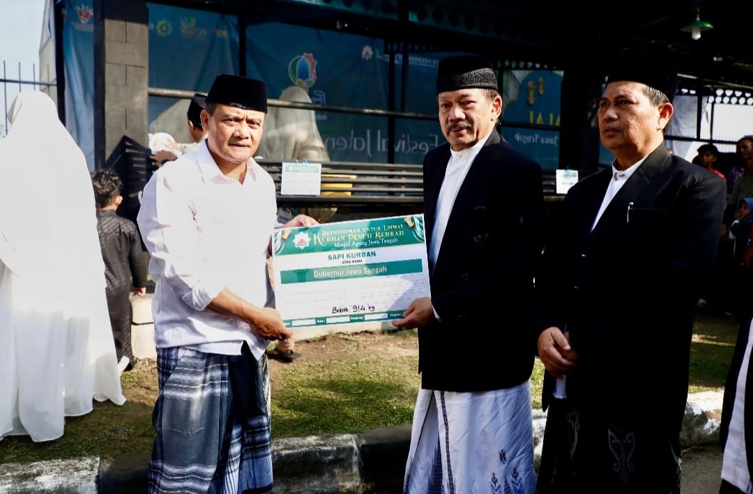 SEMARANG , E- Channel.co.id – Gubernur Jawa Tengah Ahmad Luthfi salat Idul adha di Masjid Agung Jawa Tengah (MAJT), Kota Semarang, Jumat, 6 Juni 2025. Setelah Salat Id, ia menyerahkan hewan kurban secara simbolis kepada panitia kurban MAJT.