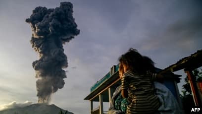 Seorang perempuan dan anaknya menyaksikan kolom abu vulkanis membubung ke udara saat erupsi Gunung Ibu, yang terlihat dari Desa Duono di Kabupaten Halmahera Barat, Provinsi Maluku Utara, Rabu, 15 Januari 2025. (Foto: Azzam/AFP)