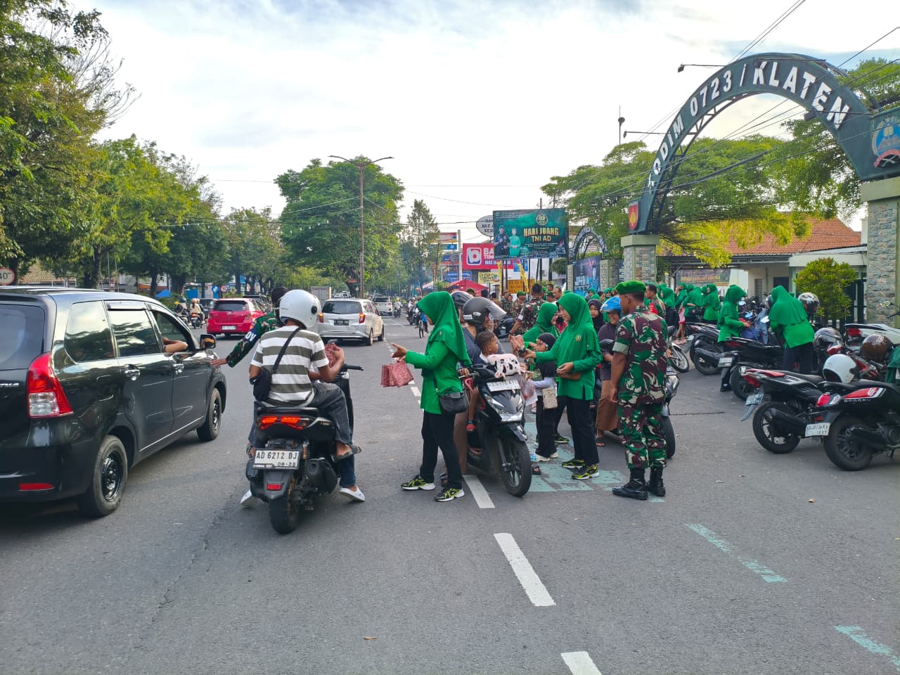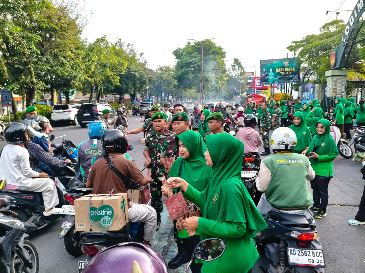 Pembagian takjil tersebut melibatkan anggota Persit Kartika Chandra Kirana (KCK) Cabang XLIV Kodim Klaten yang secara langsung turun ke lapangan untuk membagikan paket takjil kepada para pengguna jalan.