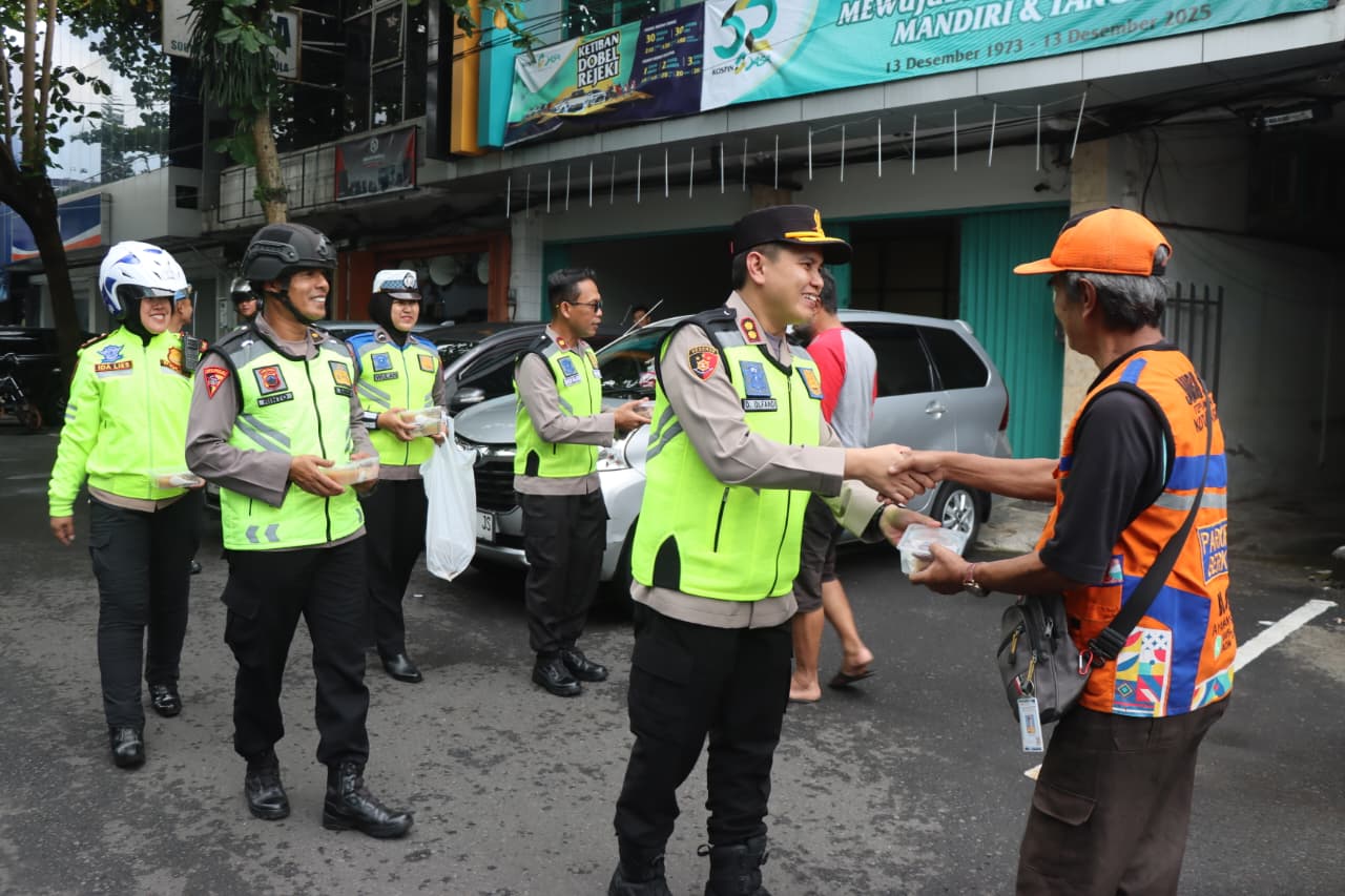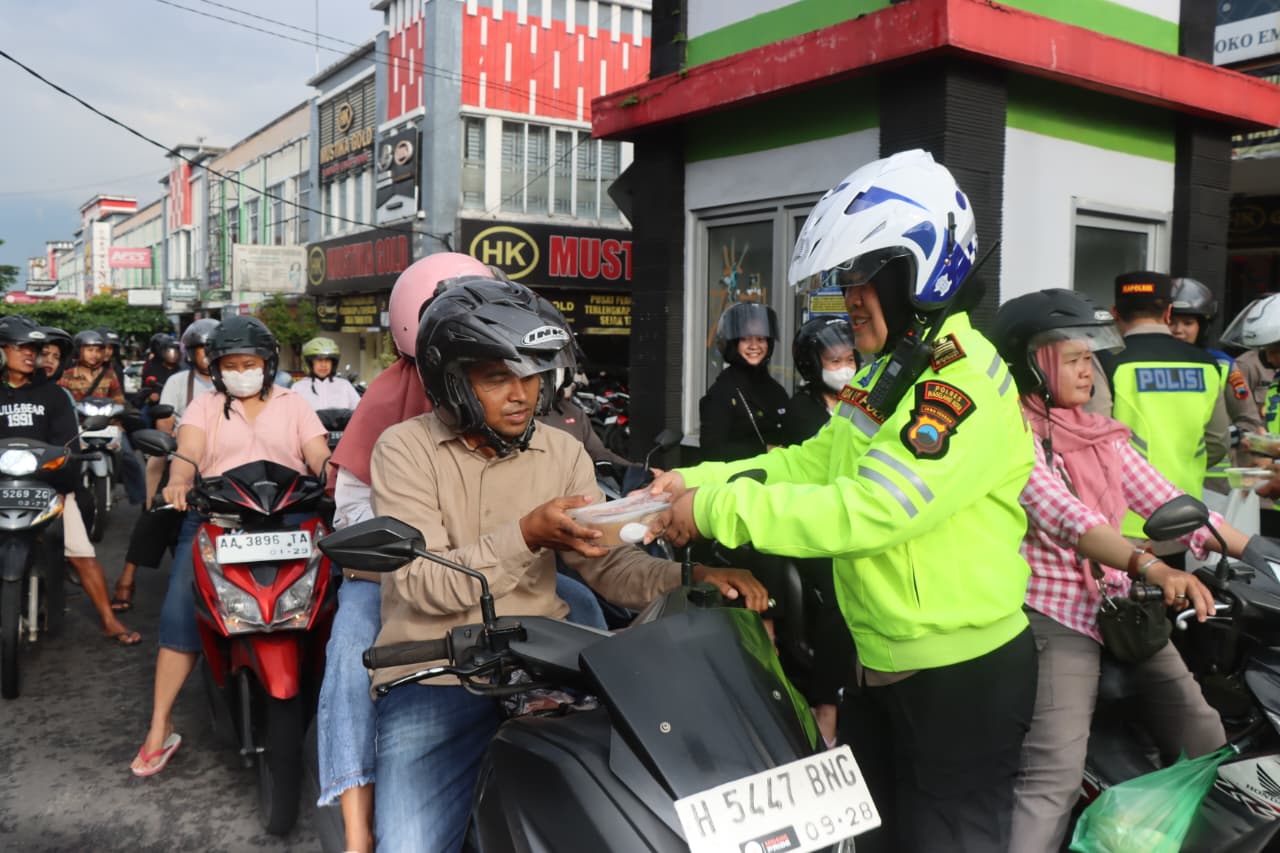 Pembagian takjil dilakukan secara tertib dengan tetap memperhatikan kelancaran arus lalu lintas. Personel tampak membagikan paket takjil kepada pengendara roda dua, roda empat, serta pejalan kaki dengan pendekatan yang humanis. Warga pun menyambut kegiatan tersebut dengan antusias dan rasa syukur.