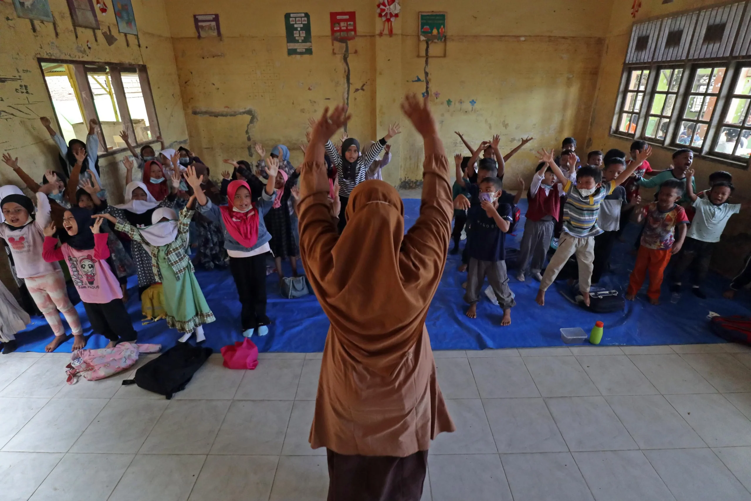 Untuk sementara, kegiatan belajar mengajar dilaksanakan dengan sarana seadanya, termasuk penggunaan terpal sebagai alas belajar. Selain itu, belum seluruh peserta didik dapat hadir karena sebagian masih mengungsi di luar daerah.