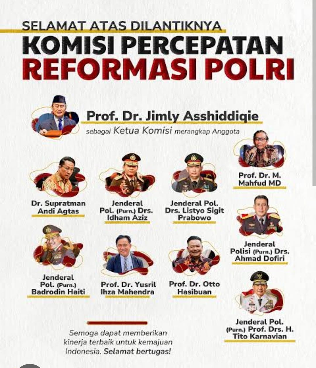 “Komisi ini diberikan mandat untuk melakukan penjaringan aspirasi masyarakat, mengkaji berbagai kebijakan dan produk regulasi yang berkaitan dengan Polri, serta merumuskan rekomendasi strategis sebagai bahan pertimbangan Presiden dalam mendorong reformasi Polri,” jelas Faisal.