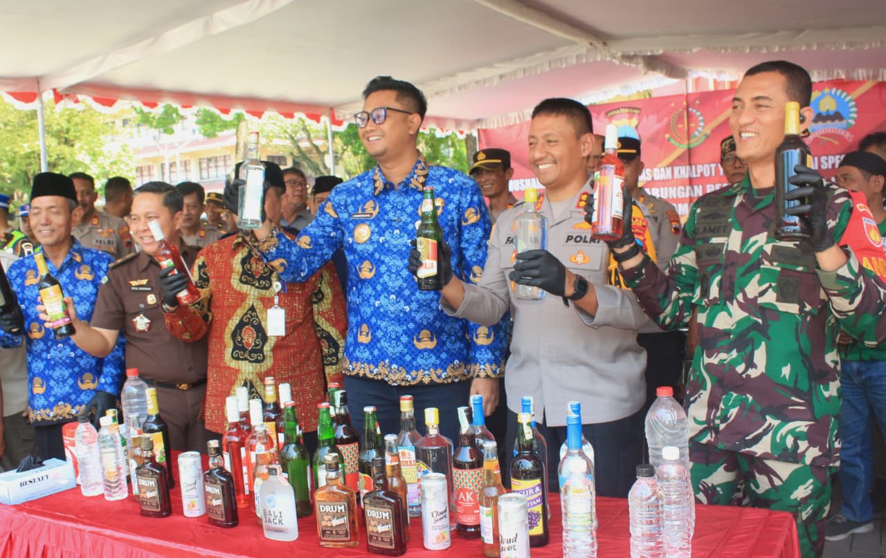 Adapun barang bukti yang dimusnahkan meliputi 15.684 botol minuman keras, terdiri dari 14.203 botol jenis ciu dan 1.481 botol minuman beralkohol berbagai merek, serta 769 unit knalpot tidak sesuai spesifikasi teknis.