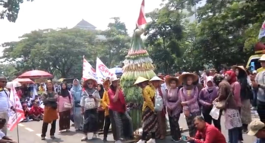 Berbeda dari aksi demonstrasi pada umumnya, para buruh datang mengenakan pakaian adat dari berbagai daerah di Indonesia. Mereka juga membawa sebuah gunungan berisi hasil pertanian seperti buah dan sayur, sebagai simbol upacara ruwatan atau tolak bala yang menjadi tradisi budaya Jawa.