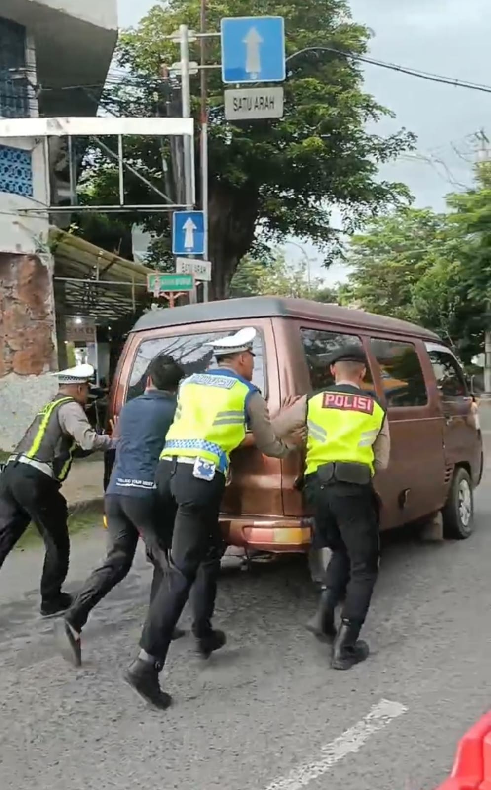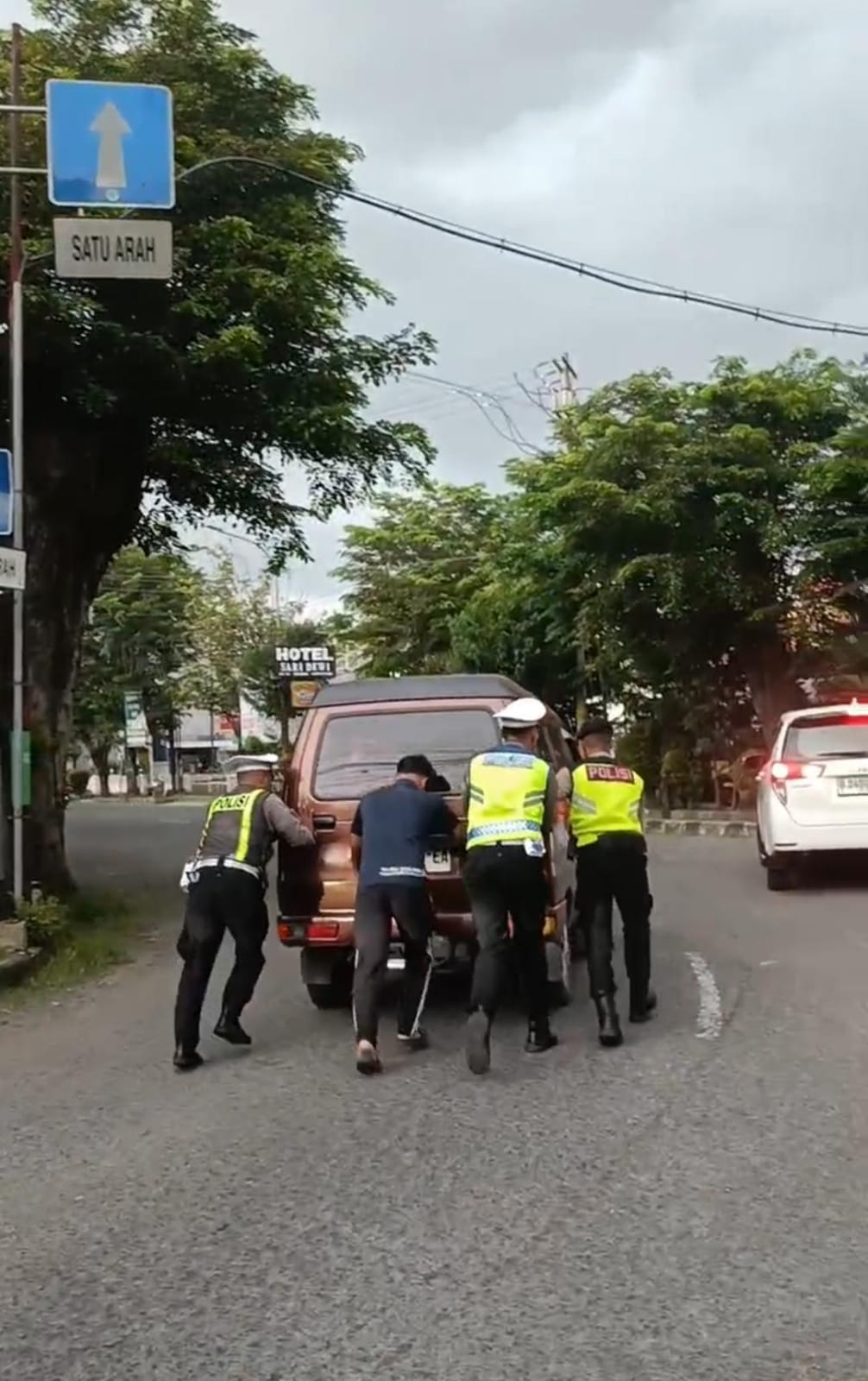 Melihat kondisi tersebut, petugas yang sedang melaksanakan pemantauan arus lalu lintas langsung turun tangan memberikan bantuan. Kendaraan didorong ke lokasi yang lebih aman guna menghindari kemacetan, sekaligus dilakukan pengecekan awal terhadap kondisi mobil.