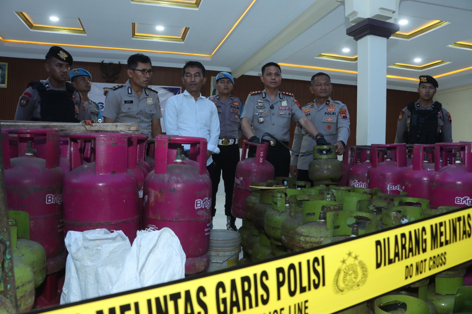 Dalam pengungkapan tersebut, polisi juga menyita sejumlah barang bukti berupa 457 tabung gas dengan rincian 268 tabung LPG 3 kilogram, 181 tabung LPG 12 kilogram berwarna pink dan biru, serta tujuh tabung LPG 50 kilogram.