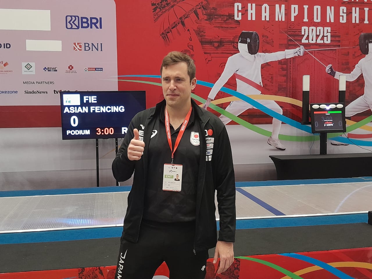 Nusa Dua, E channel.co.id – Pelatih Kepala Tim Anggar Jepang, Jeremo Jean Guth terlihat gembira saat anak-anak asuhannya sukses meraih medali emas nomor beregu degen putra dan sabel putri pada Kejuaraan Anggar Asia 2025 yang berlangsung di Bali International Convention Centre The Resort Westin Nusa Dua, Bali, Sabtu (20/6/2025).
