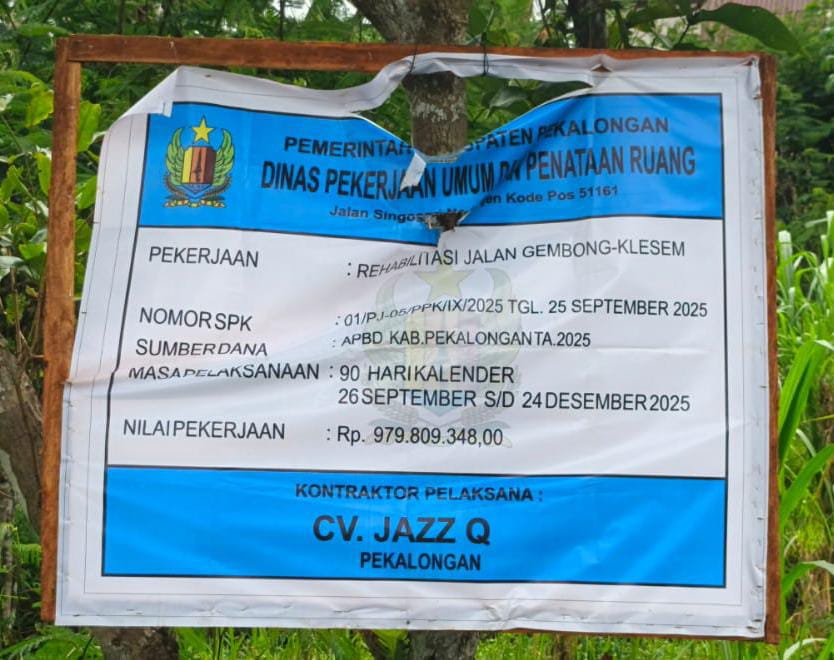 Proyek tersebut dibiayai dari Anggaran Pendapatan dan Belanja Daerah (APBD) Kabupaten Pekalongan Tahun 2025 dengan nilai mencapai Rp979.809.348. Pekerjaan dilaksanakan oleh CV Jazzq Q sebagai penyedia jasa pelaksana dan dikerjakan pada bulan Desember 2025.