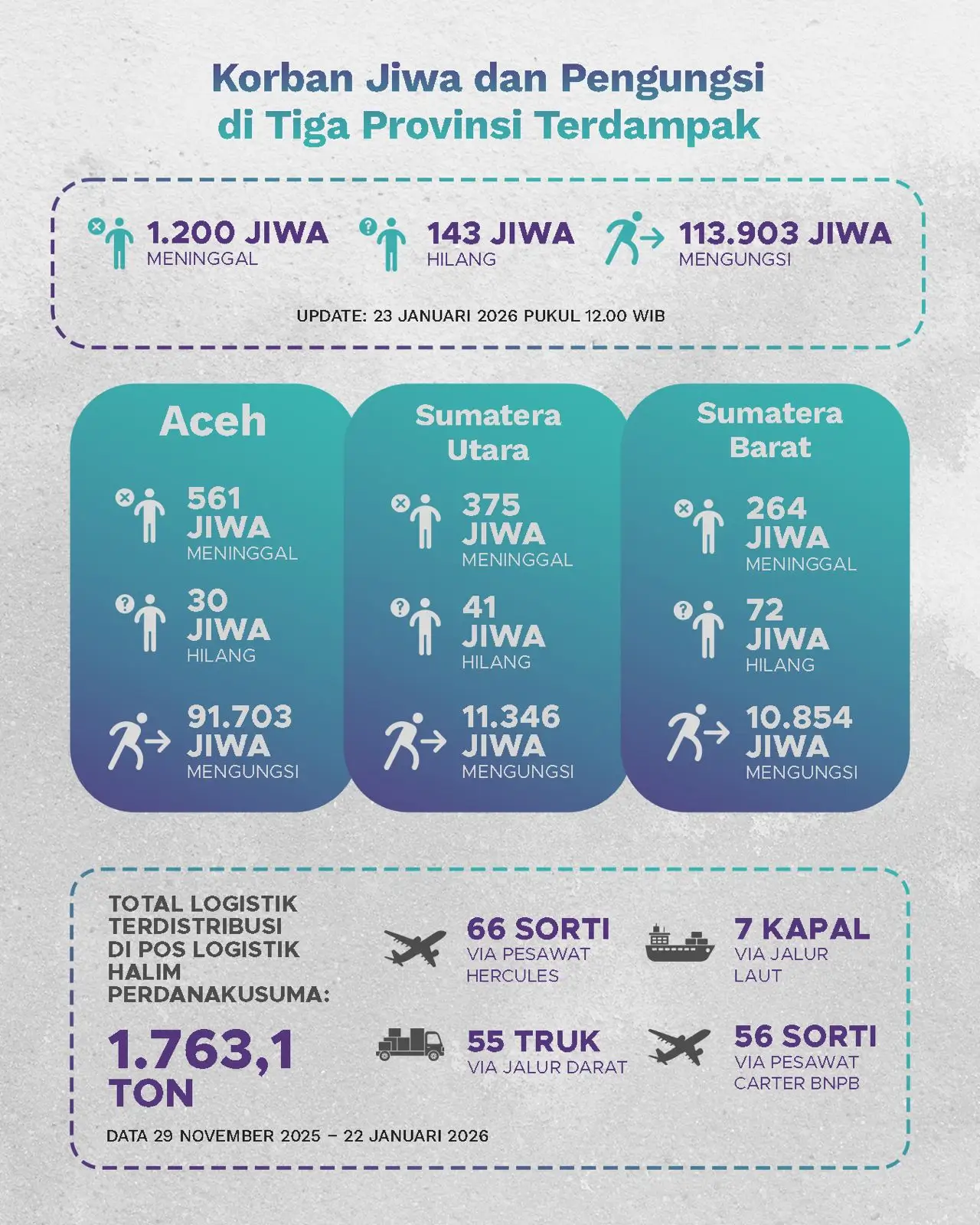 Berdasarkan laporan distribusi logistik yang berhasil dihimpun sejak 29 November 2025 hingga 22 Januari 2026, total bantuan logistik yang telah disalurkan kepada masyarakat terdampak mencapai 1.763,1 ton.