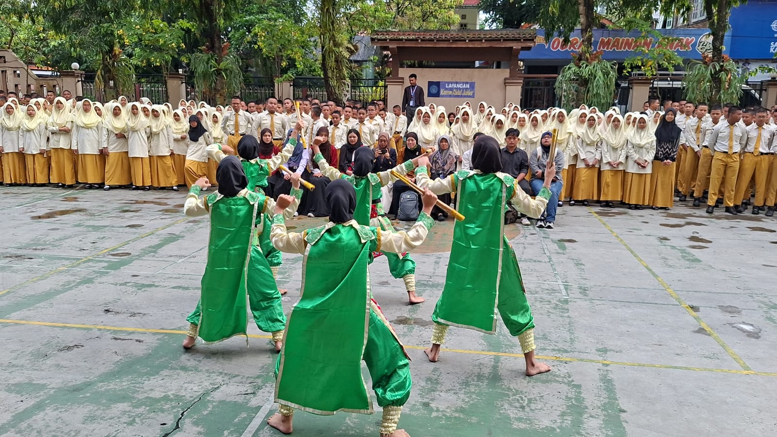 Tiba di halaman SMP Plus rombongan disambut jajaran pimpinan, staf, guru, dan ratusan siswa. Di sini rombongan disuguhi tarian ‘Cokro Doro’ yang dimainkan memukau oleh lima siswa MPlus.