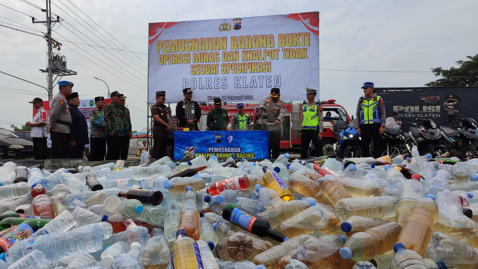 Klaten, KabarTerkiniNews.co.id – Polres Klaten bersama jajaran Forum Koordinasi Pimpinan Daerah (Forkopimda) Kabupaten Klaten memusnahkan ribuan botol minuman keras dan ratusan knalpot tidak sesuai spesifikasi sebagai hasil operasi penanggulangan penyakit masyarakat menjelang Ramadan. Kegiatan ini digelar sebagai bentuk komitmen bersama dalam menjaga ketertiban dan kekhusyukan ibadah masyarakat, Kamis (19/02).