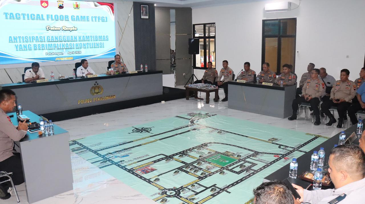 Pekalongan, KabarTerkiniNews.co.id – Dalam rangka mengantisipasi potensi gangguan kamtibmas yang berimplikasi kontijensi, Polres Pekalongan menggelar kegiatan Tactical Floor Game (TFG), Selasa (21/4/2026) sore di Aula Setia Polres Pekalongan.