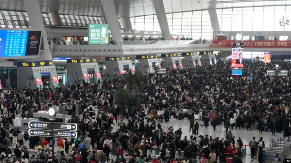 Kerumunan penumpang yang menunggu untuk naik kereta mulai membeludak di Hangzhou, China menjelang liburTahun Baru Imlek, Sabtu, 18 Januari 2025. (AP Photo/Aaron Favila)