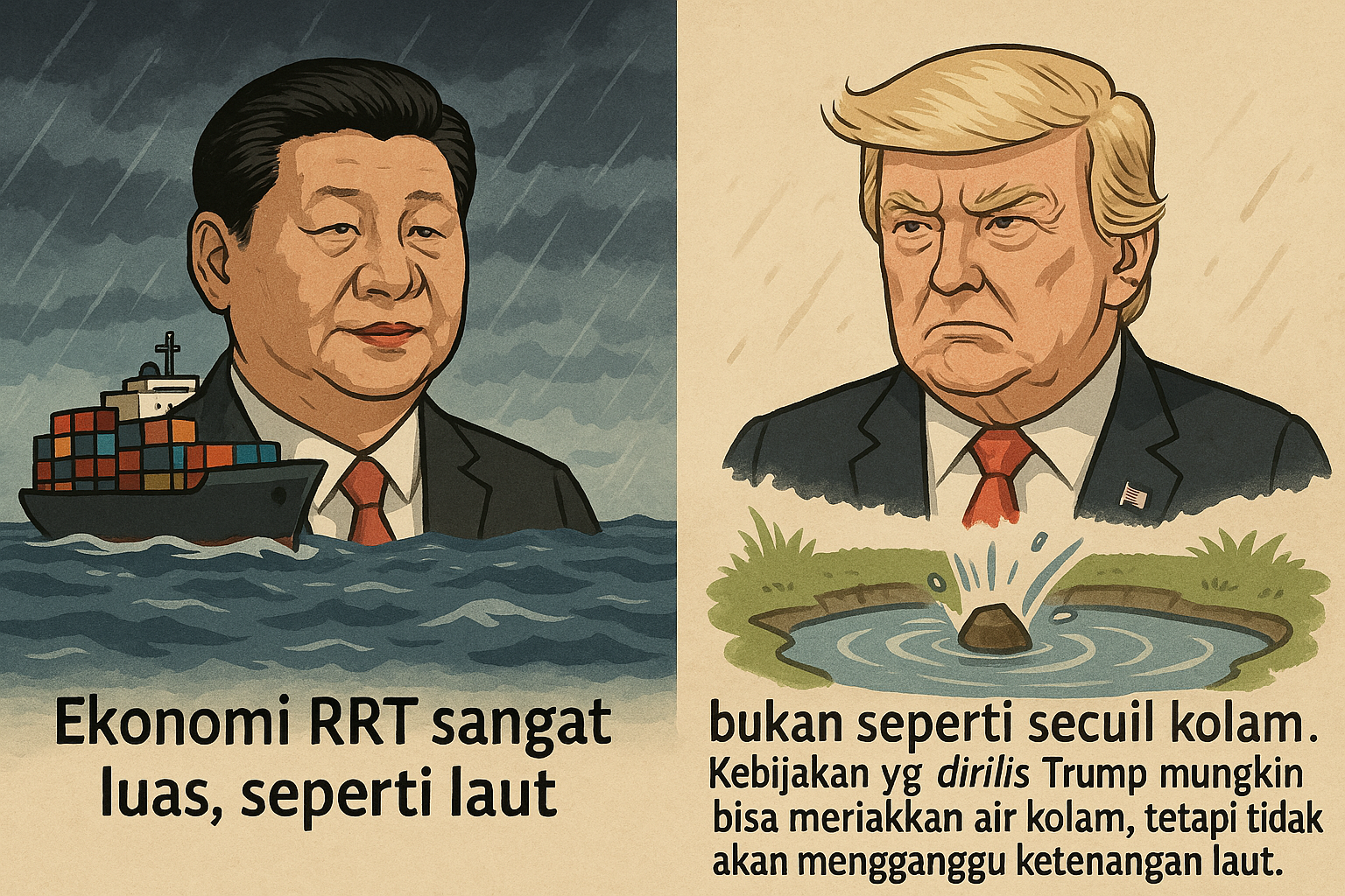 “Ekonomi RRT sangat luas, seperti laut, bukan seperti secuil kolam. Kebijakan yang dirilis Trump mungkin bisa meriakkan air kolam, tetapi tidak akan mengganggu ketenangan laut.”