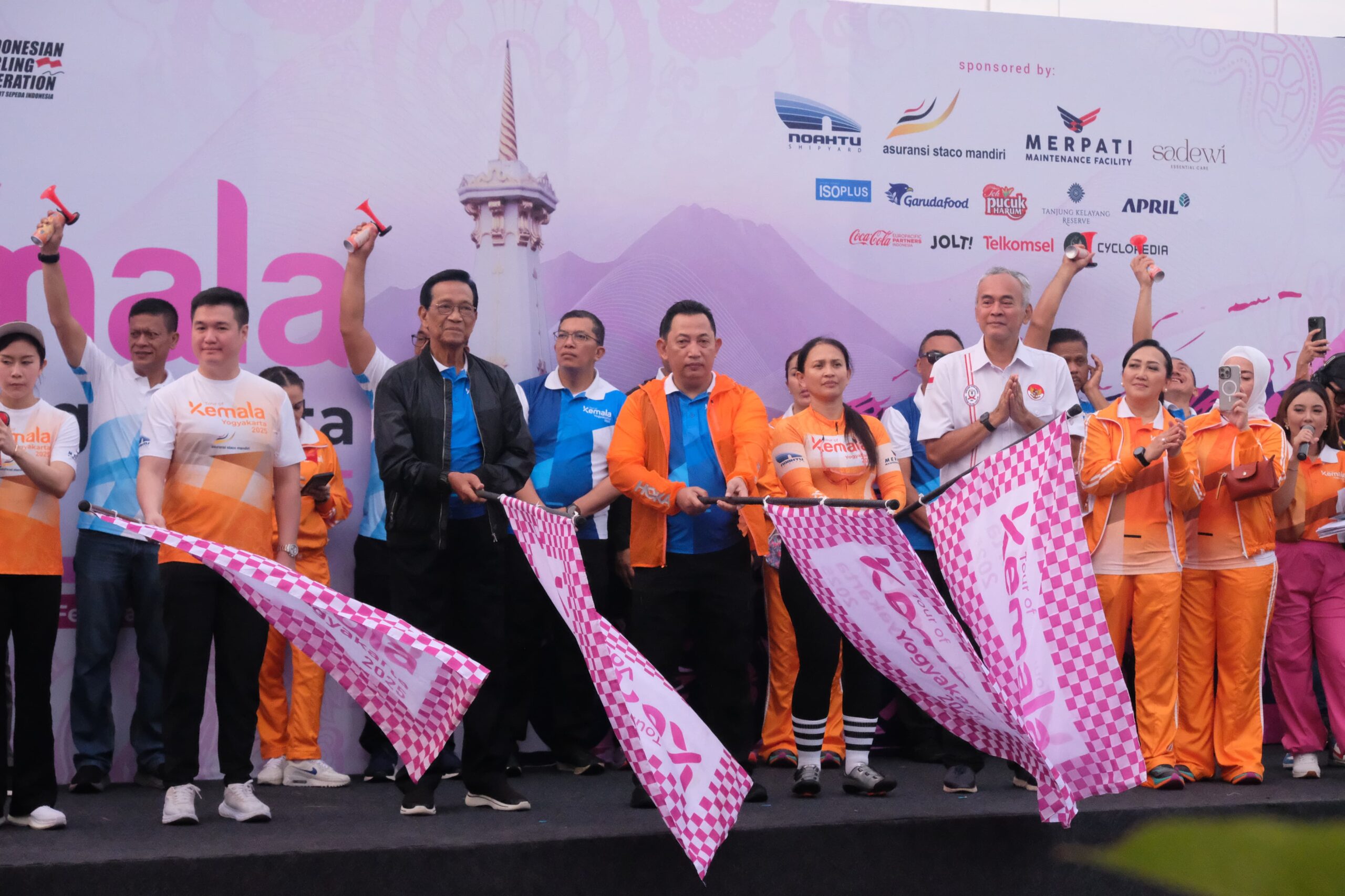 Yogyakarta – Ribuan pesepeda memadati jalanan Yogyakarta dalam ajang Tour of Kemala 2025 yang resmi dimulai di Jogja Expo Center (JEC), Minggu (16/2/2025). Acara bergengsi ini dilepas langsung oleh Kapolri Jenderal Listyo Sigit Prabowo bersama Gubernur DIY Sri Sultan Hamengkubuwono X serta jajaran pejabat daerah.