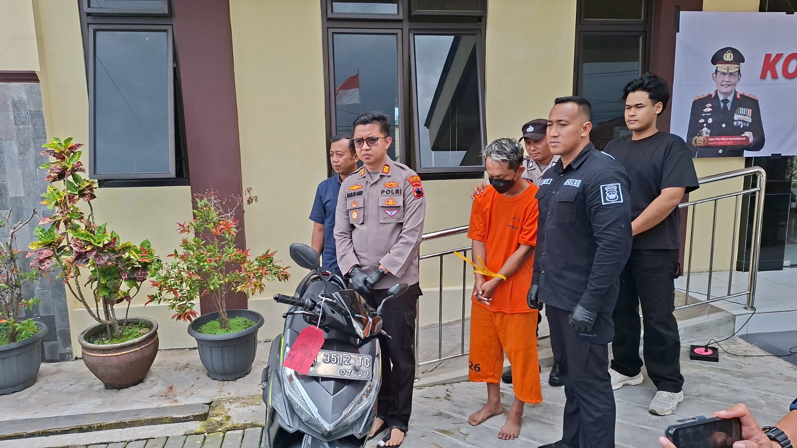 Saat diinterogasi, pelaku mengaku melakukan aksi penjambretan menggunakan sepeda motor Honda Vario 125 warna hitam yang kemudian diamankan sebagai barang bukti. Turut disita STNK dan pakaian yang digunakan pelaku serta barang bukti pelengkap lain.