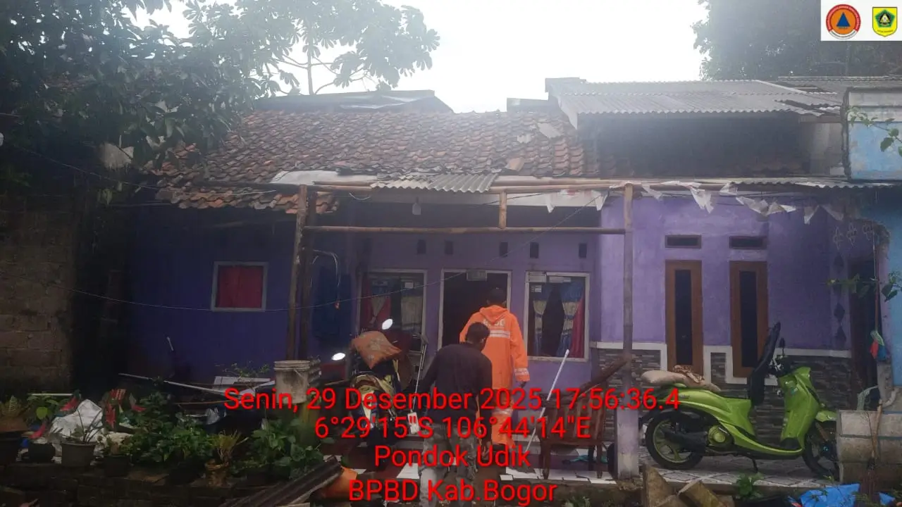 Laporan pertama adalah kejadian angin kencang yang menerjang Kabupaten Bogor, Jawa Barat pada Senin (29/12). Dipicu oleh hujan deras, angin kencang menerjang rumah warga yang berlokasi di Desa Pondok Udik dan Jampang wilayah Kecamatan Kemang. Sebanyak 42 unit rumah alami rusak ringan dan 13 unit rumah lainnya alami rusak sedang, serta satu pabrik tempe alami rusak sedang. Dari kejadian ini, total 55 kepala keluarga terdampak. Dilaporkan terdapat tujuh kepala keluarga mengungsi ke rumah kerabat yang lebih aman. BPBD Kabupaten Bogor langsung menuju lokasi terdampak untuk melakukan kaji cepat. Kondisi terkini, beberapa rumah sudah diperbaiki.