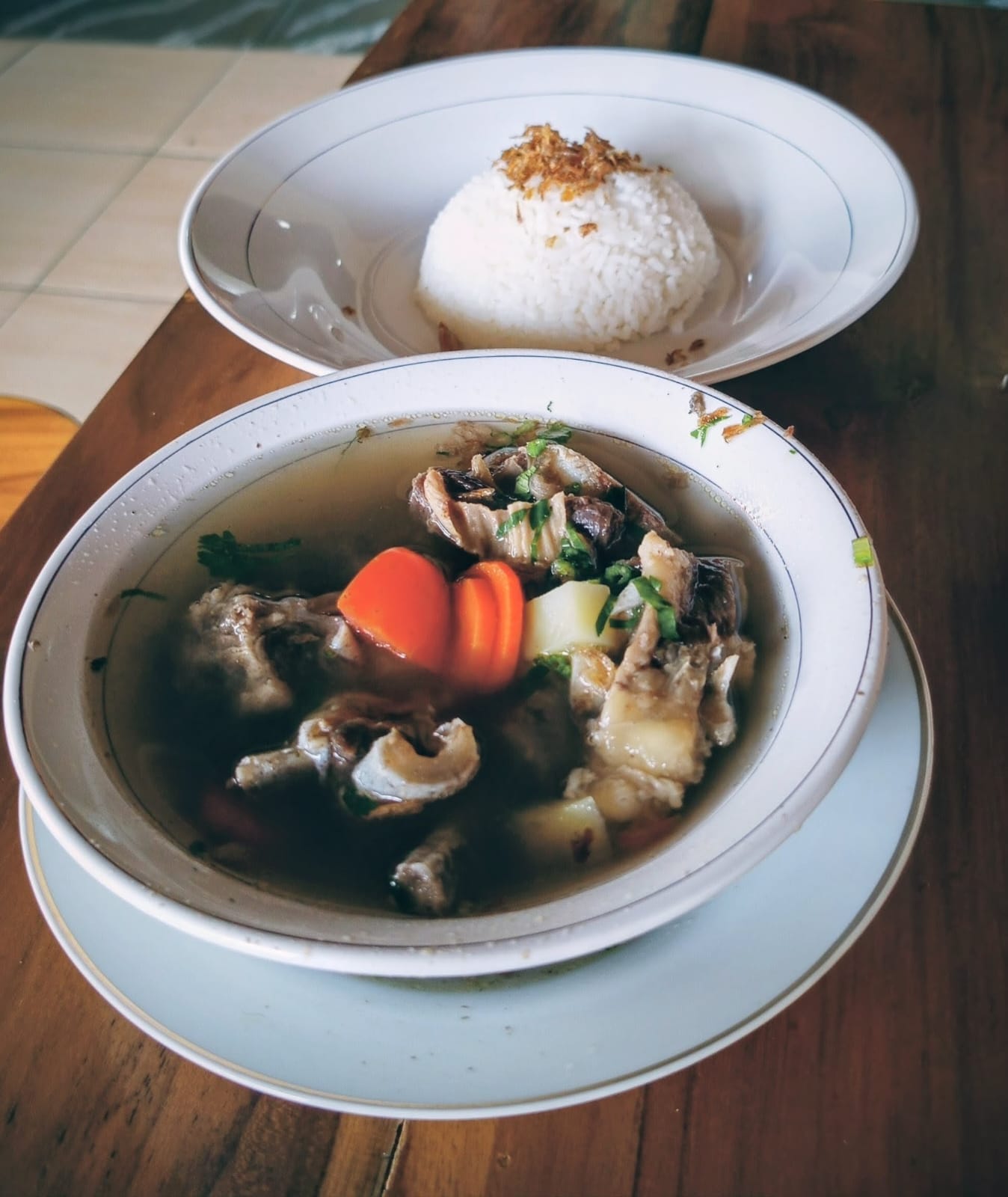 Berbeda dengan sop iga lainnya, sop kaldu iga yang kaya rempah di resto dengan view persawahan ini menjadi menu utama, sehingga rasanya lebih mantap.