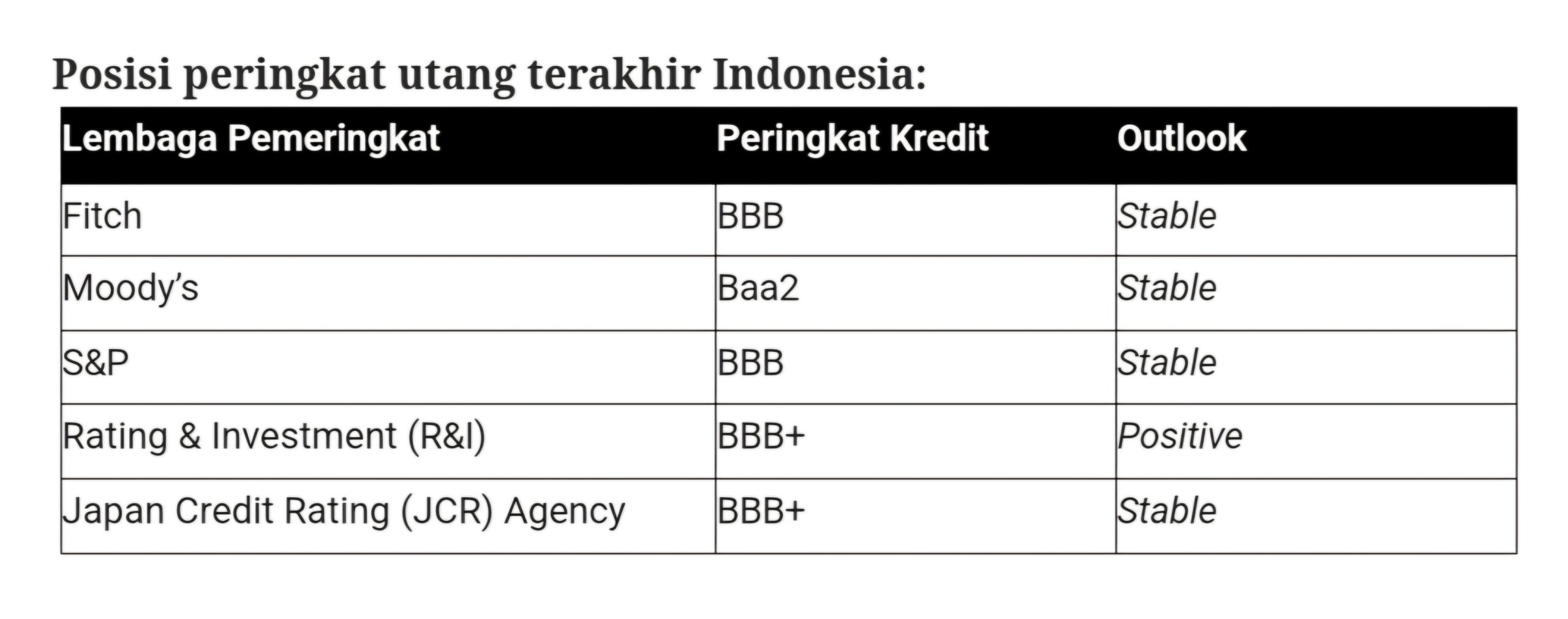 Outlook stabil juga menggambarkan keyakinan S&P akan keberlanjutan disiplin fiskal. S&P memproyeksi defisit fiskal Indonesia akan tetap berada di bawah 3% dari PDB selama tiga tahun ke depan. Meskipun terdapat tantangan global yang belum mereda, kebijakan fiskal Indonesia dinilai tetap terukur dan konsisten.