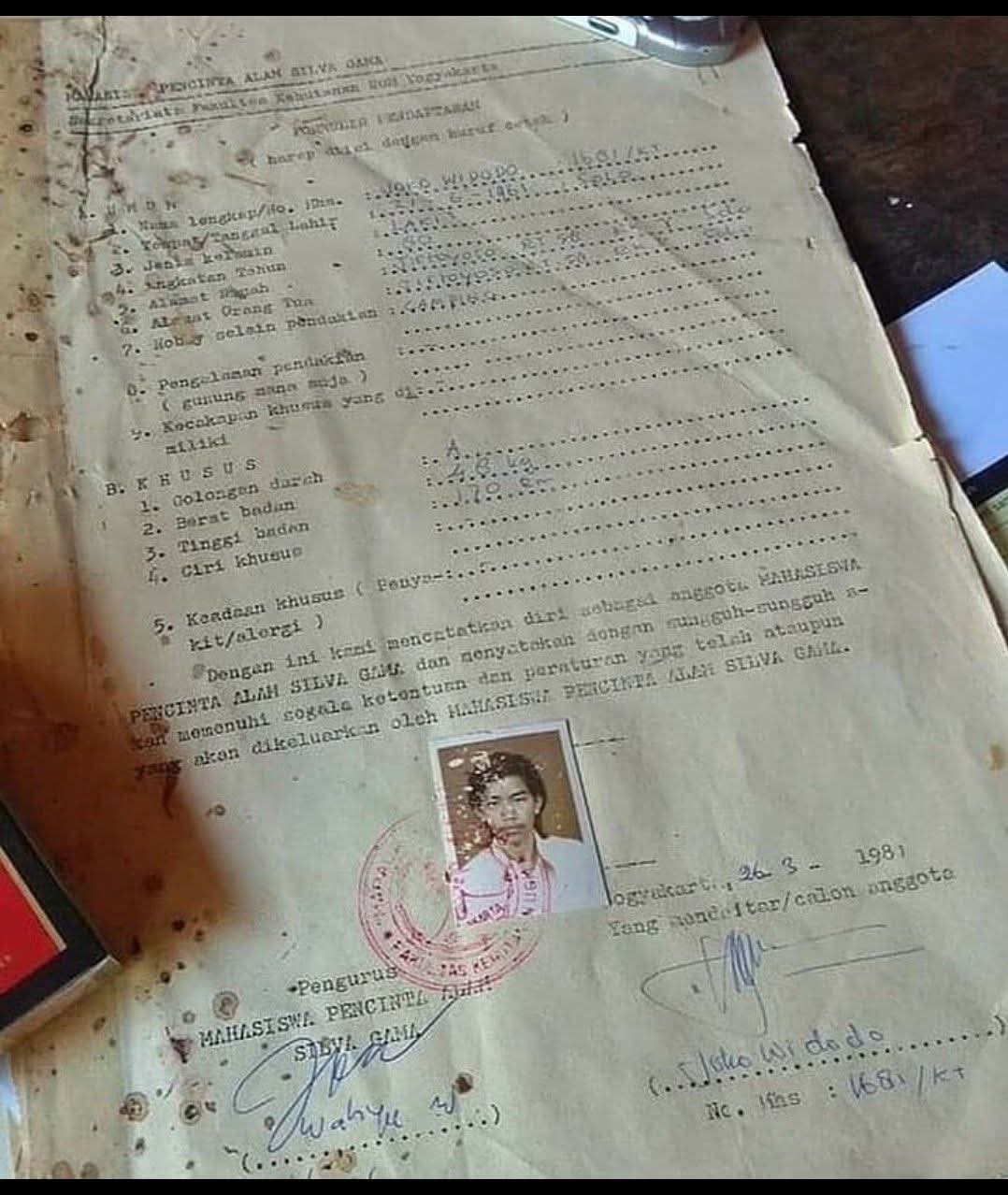 Foto yang beredar menampilkan Jokowi muda mengenakan pakaian santai khas kegiatan luar ruang, lengkap dengan pas foto resmi yang ditempel di formulir pendaftaran keanggotaan. Tertulis nama lengkapnya: Ir. Joko Widodo, serta data pribadi lainnya termasuk tinggi badan dan golongan darah. Dokumen tersebut bertanggal 26 Maret 1981.