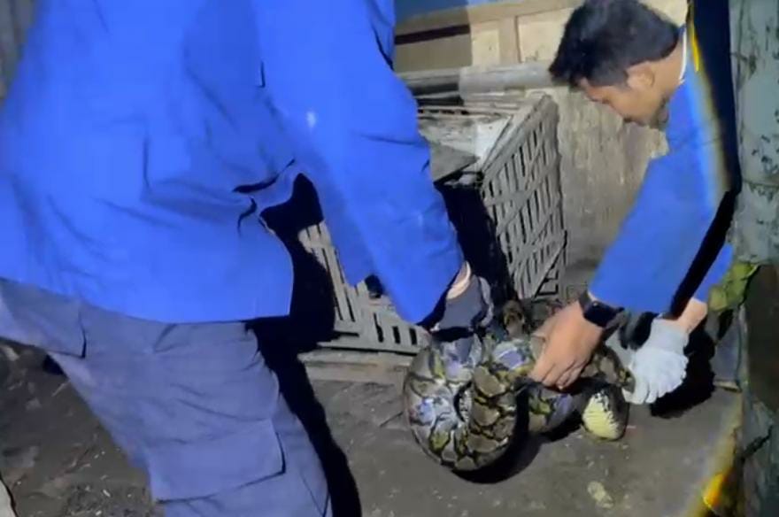 ” Ular panjang kurang lebih 4-5 meter, dengan besaran sekitar paha orang dewasa, saat kami evakuasi tidak agresif karena usai memangsa ayam,” Terangnya.