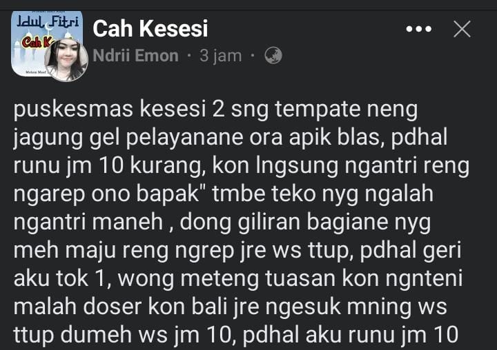 PEKALONGAN — Seorang warga Kecamatan Kesesi, Kabupaten Pekalongan, mengeluhkan buruknya pelayanan di Puskesmas Kesesi 2 yang berlokasi di Desa Jagung. Keluhan tersebut diungkapkan melalui unggahan di grup Facebook Cah Kesesi oleh akun bernama Endrii Emon pada Jumat (25/4/2025).