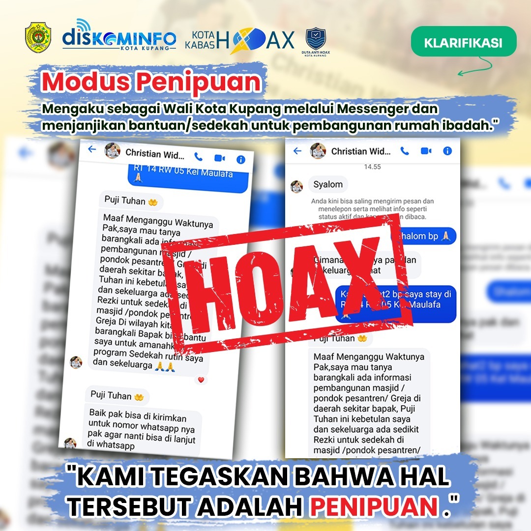 akun tersebut juga mengirimkan pesan melalui Messenger kepada masyarakat dengan modusnya adalah menjanjikan pemberian bantuan atau sedekah untuk pembangunan rumah ibadah di wilayah Kota Kupang.